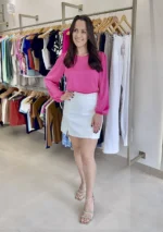 Com manga longa bufante e elástico nos punhos, ela traz um toque romântico e cheio de estilo ao visual.