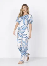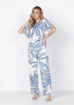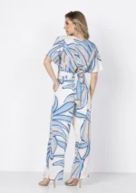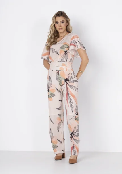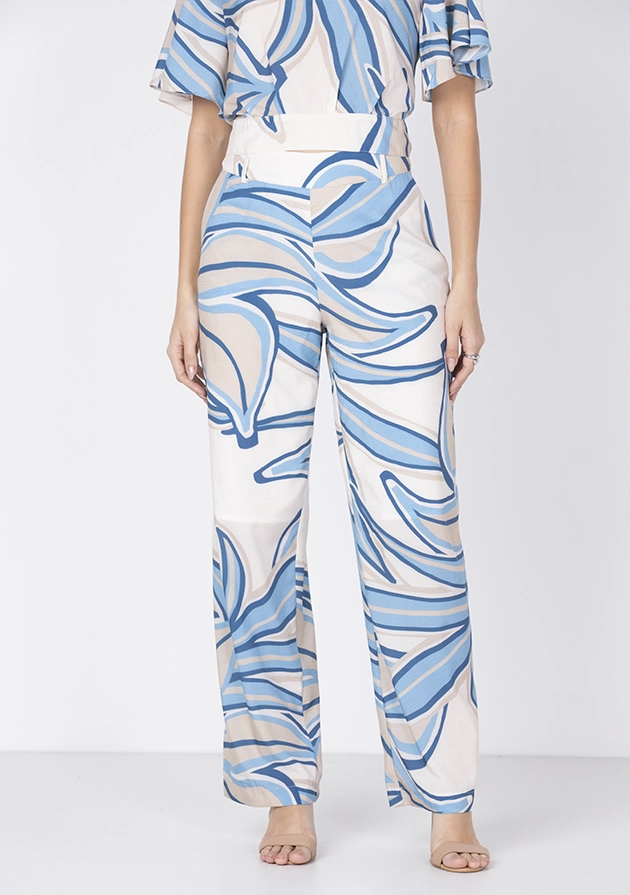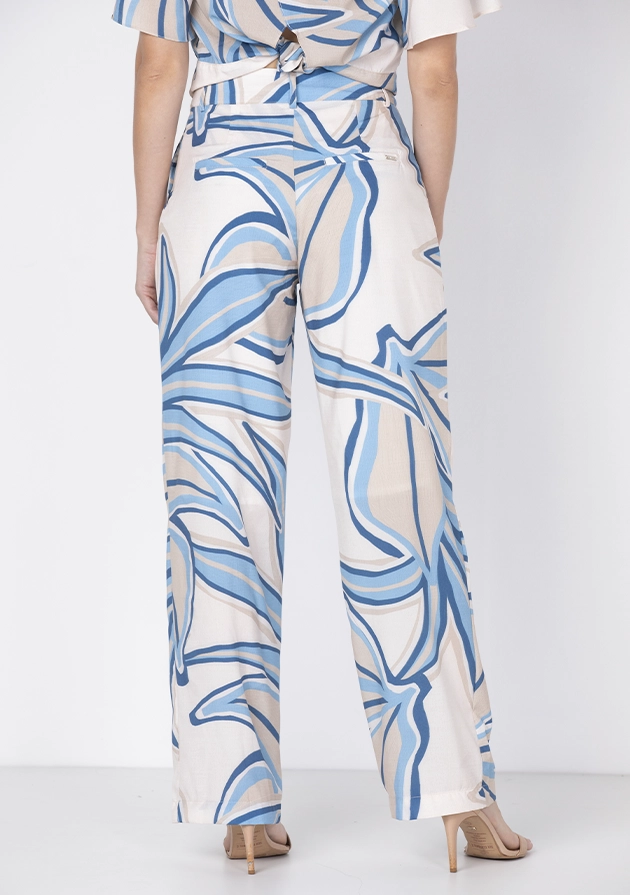 Calça estilo pantalona estampada, confeccionada em tecido leve e fluido, ideal para quem busca conforto com elegância.