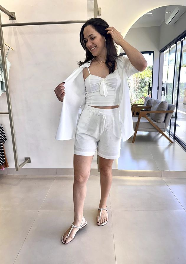 O tecido natural traz um toque sofisticado e agradável à pele, ideal para compor produções elegantes e frescas.